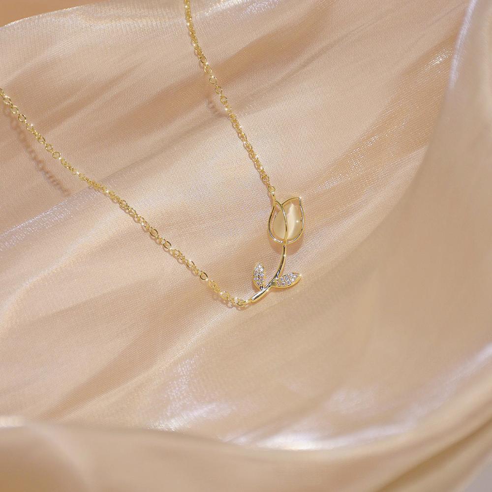 Elegant 14K Gold Rose Flower Necklace with Opal Zircon